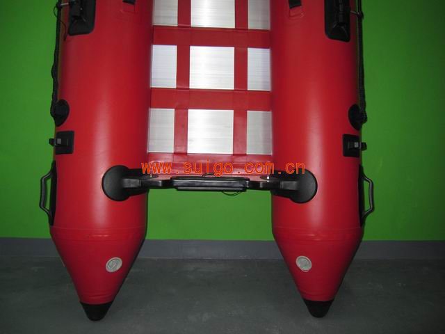 3.由于充气船艇两侧有浮力胎,艇体横向倾侧入水的可能程度很小,再加上产品设计制造中有专门的稳定性测试的保证,因此在最大载重即使还有较大的风浪)时,它也不会横向倾覆! 4人机动艇(铝合金底板)