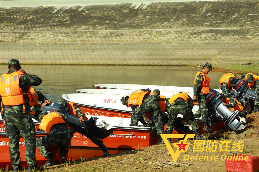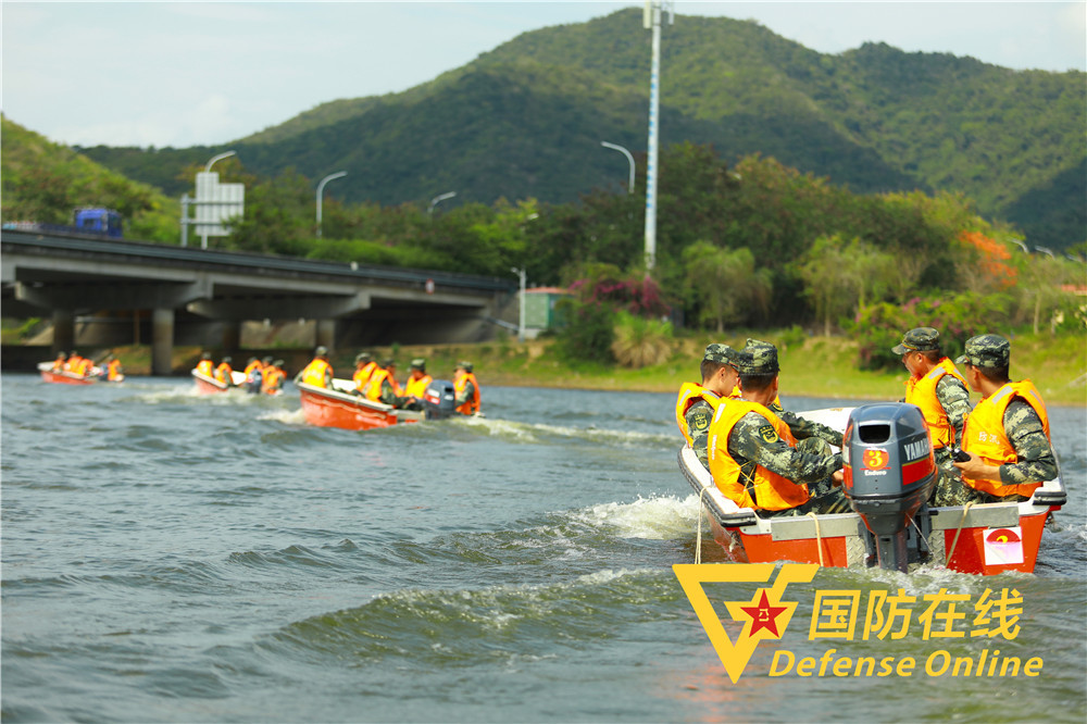 武警官兵驾驶冲锋舟向水域行进。