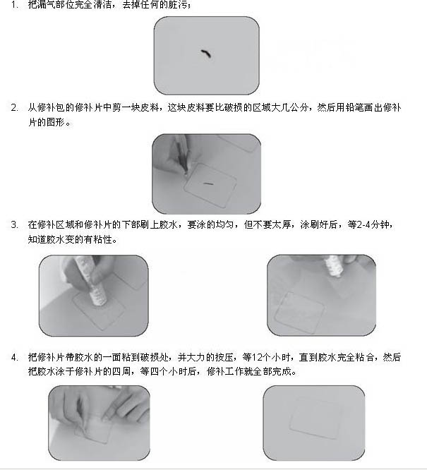 若漏气部位为气筒时,请按照下面的步骤来修补: